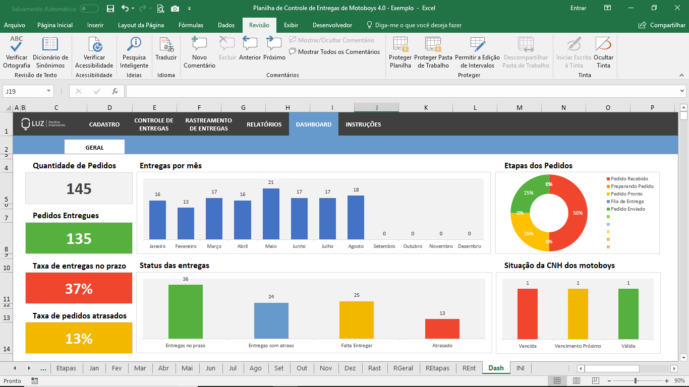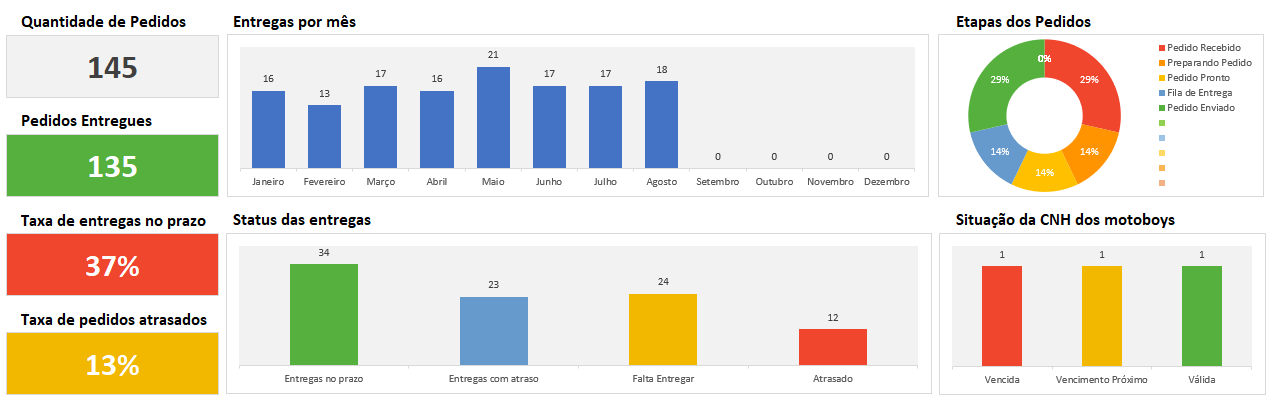 Dashboard - Entregas de MotoboysAcompanhe um painel de controle pronto automaticamente e visualizado em uma única tela com os principais indicadores e gráficos da planilha