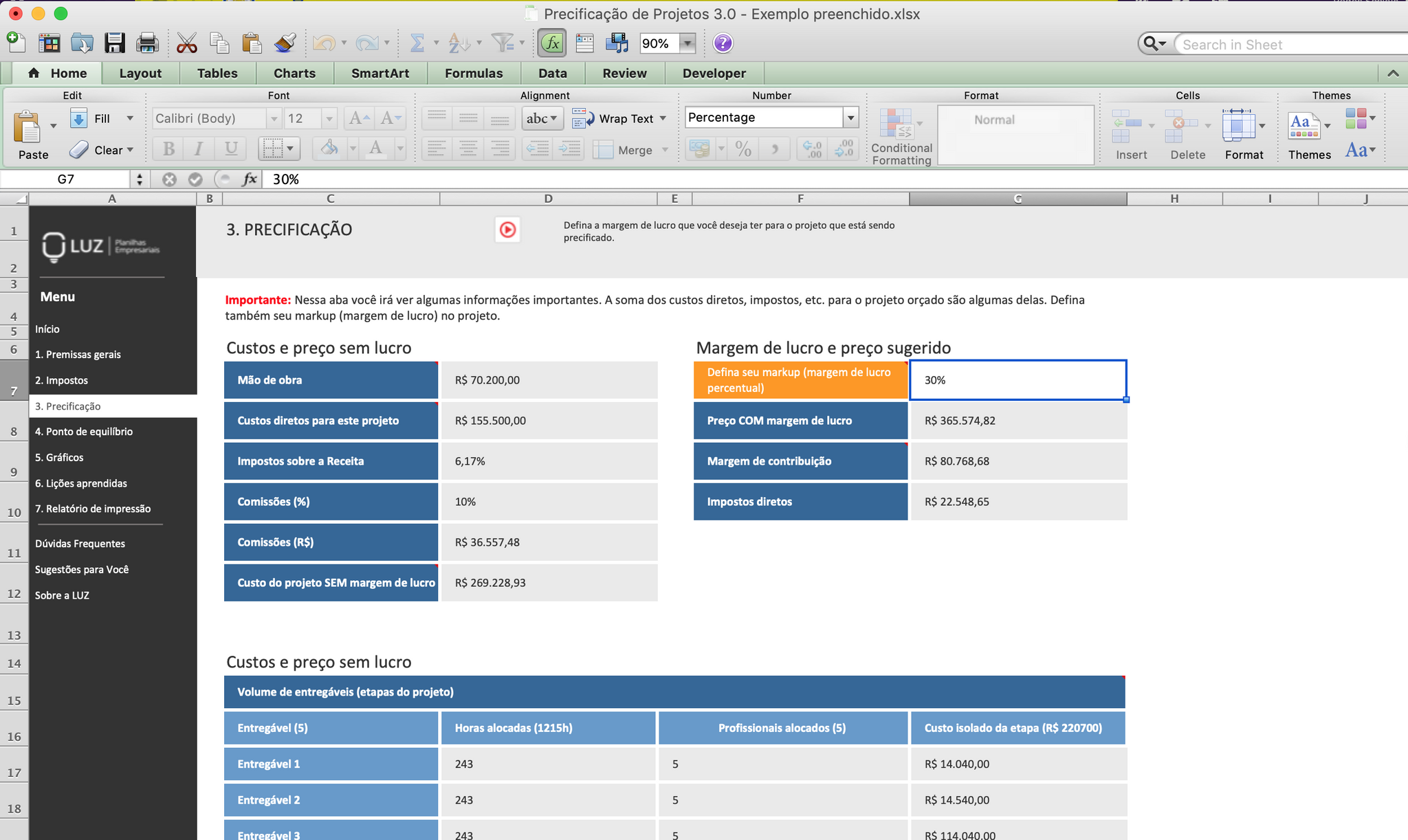 Ideal para quem vende projetos, essa planilha possui todas as melhores práticas de precificação, permitindo separar os custos por etapa e também uma alocação de horas detalhadas!