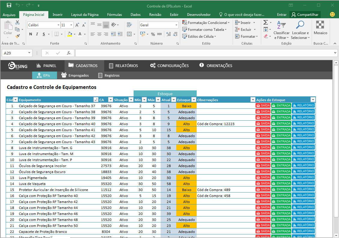 Com a planilha você controla facilmente seu estoque de EPIs. Na tela de EPIs é possível identificar aqueles que estão com estoque muito alto ou muito baixo. No Relatório de Aquisição você pode verificar sugestões de equipamentos para comprar com base nos níveis de estoque.