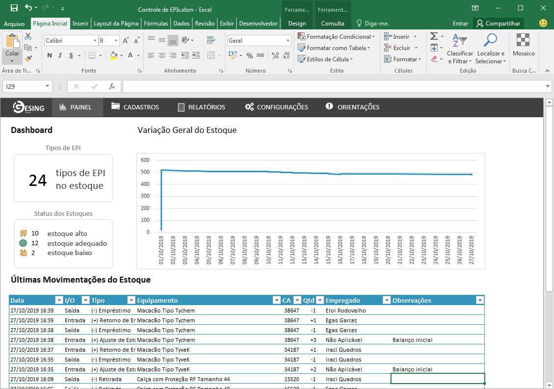 A presente planilha apoia essa atividade com o cadastro de equipamentos e informação de estoque mínimo e máximo. Em cada equipamento você pode registrar movimentações (aquisição, retirada, empréstimo, descarte etc). As movimentações ficam registradas e permitem a geração automatizada da ficha de EPI.